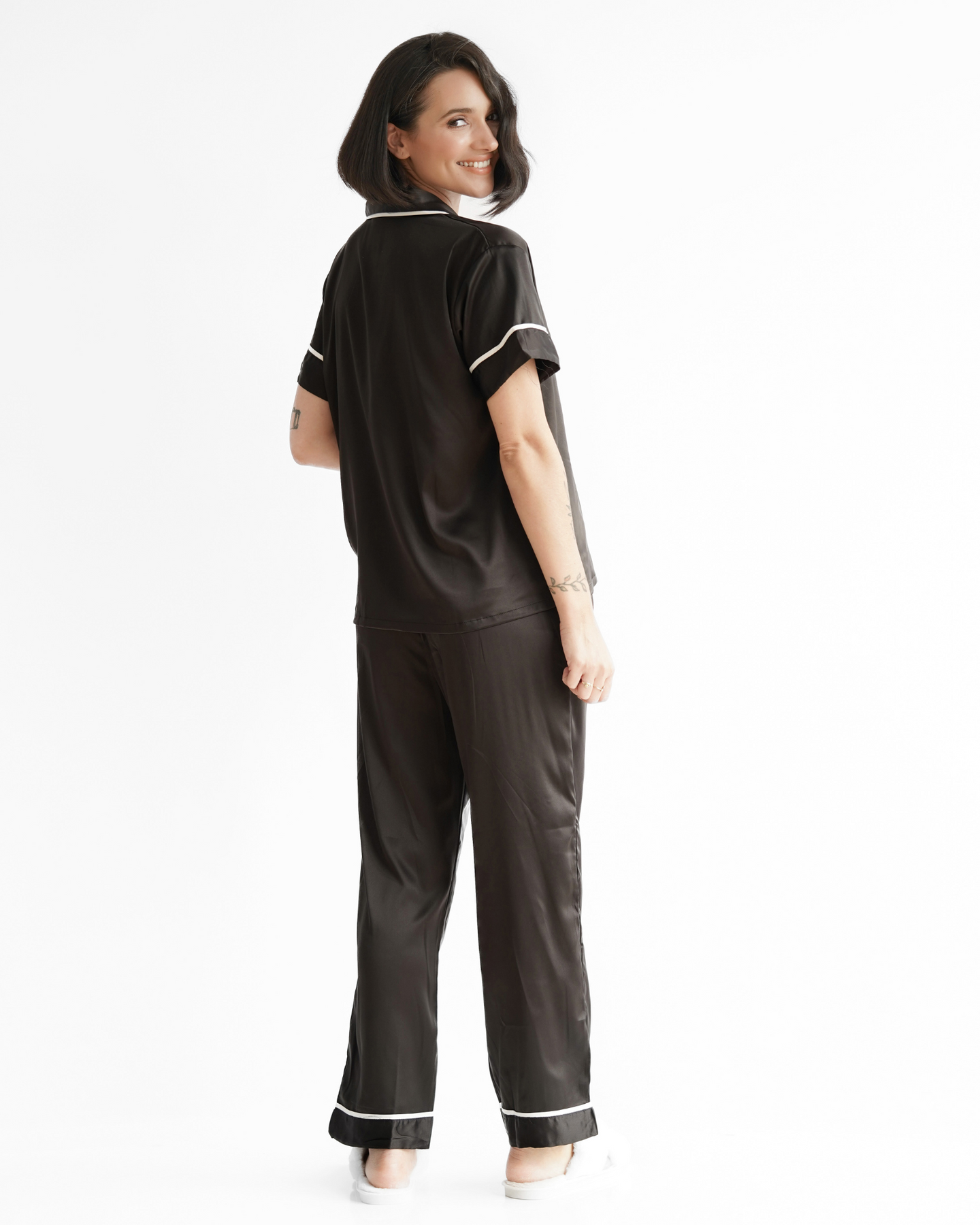 The perfect “getting ready” outfit for brides and bridesmaids, this short sleeve and long pants set combines comfort, style, and practicality. Designed with an elegant finish and thoughtful details, it’s ideal for wedding mornings, bridal party photos, or simply lounging in luxury.