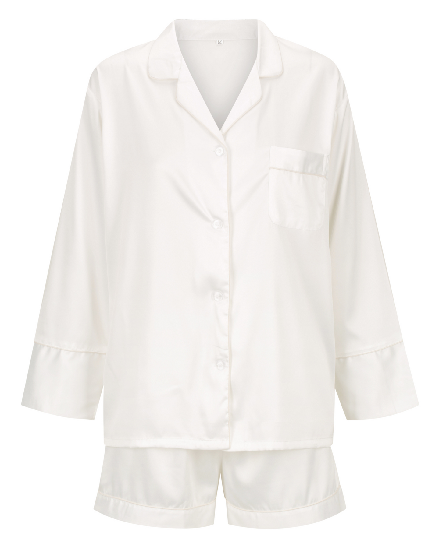 • Long sleeve shirt & shorts set with a soft satin look and feel