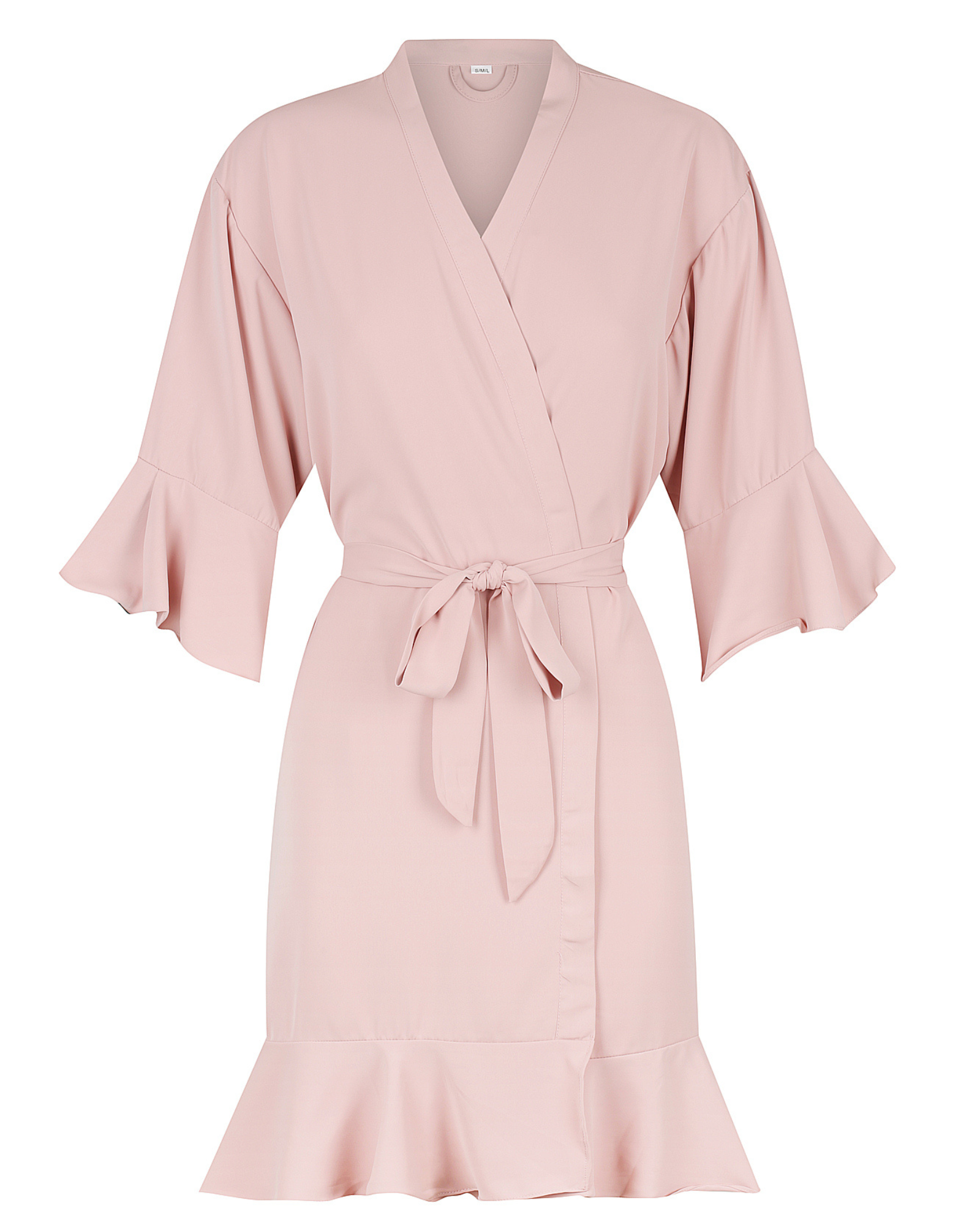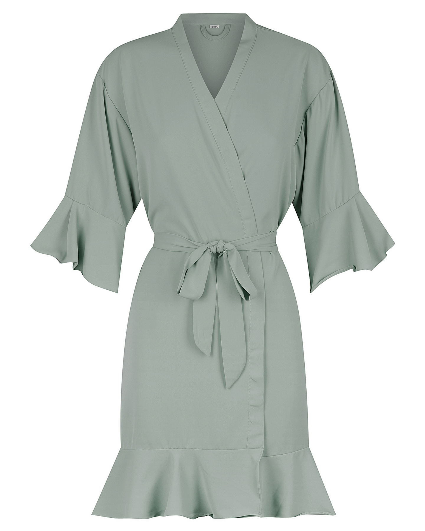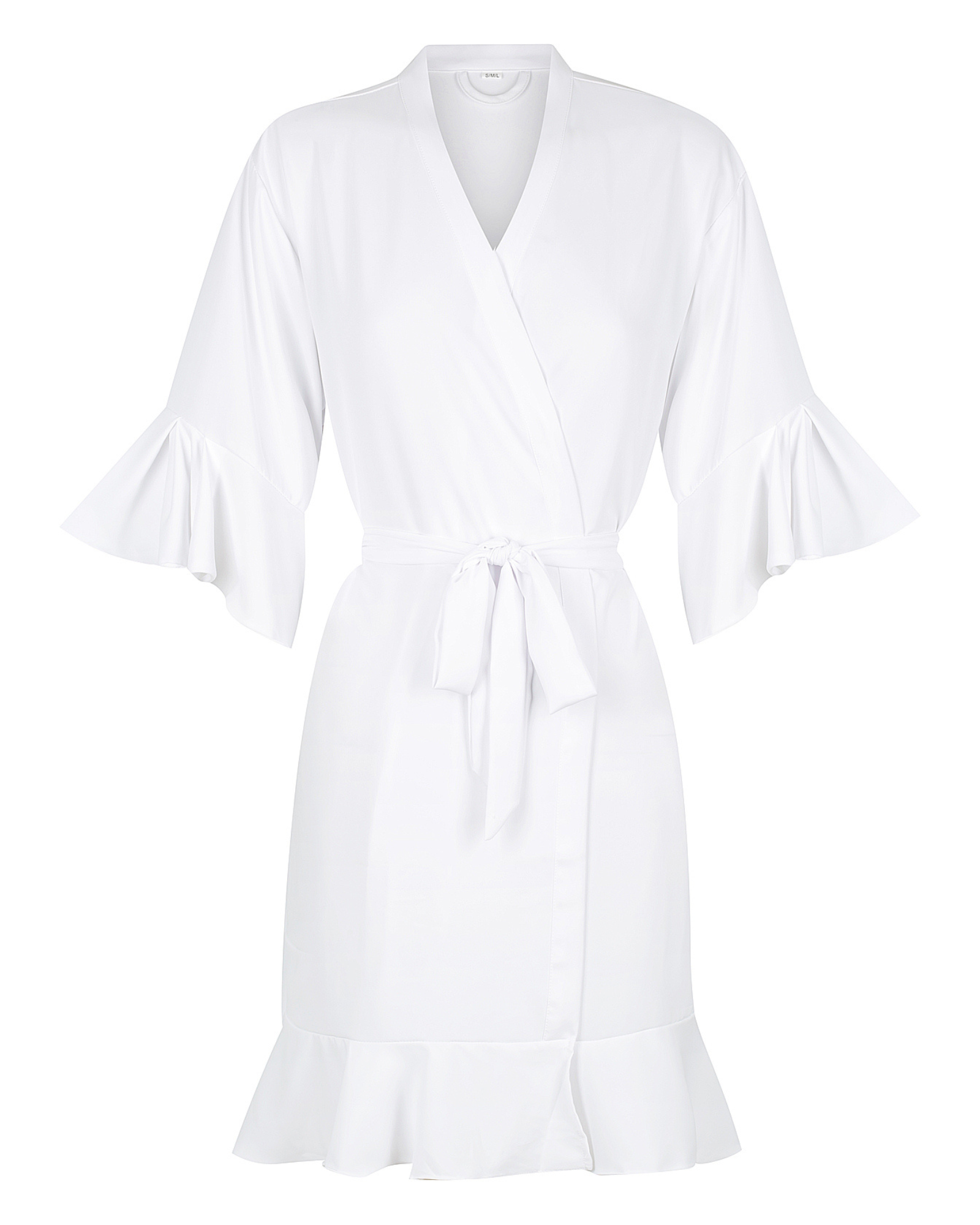 The ruffled trim along the cuffs and hem adds a feminine, flirty finish, while the adjustable waist ties and inner ties ensure a secure fit. Perfect for wedding mornings, bridal parties, and gifting, this style photographs beautifully and feels as good as it looks.